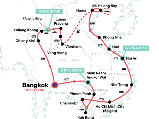 Your Big Night Out Moment: Bangkok. Guided sunrise tour of Angkor Wat temple complex. Orientation walks in Ho Chi Minh City, Hoi An, Hanoi, Phnom Penh, and Luang Prabang. Halong Bay boat cruise with lunch. Guided hike to Wat Phousi at sunset and Kuang Si waterfall excursion in Laos. Slow boat up the Mekong. Three street food crawls in different cities. Internal flight. All transport between destinations and to/from included activities.
